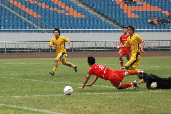 袁微将球轻轻一拨准备过人射空门,却被对方守门员扑倒在地,裁判果断的给以点球的惩罚。