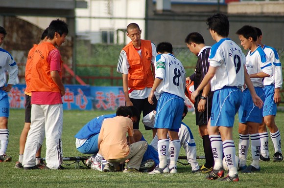 队员除了在拼抢中受伤外,还有自己被场地给忽悠倒了的。