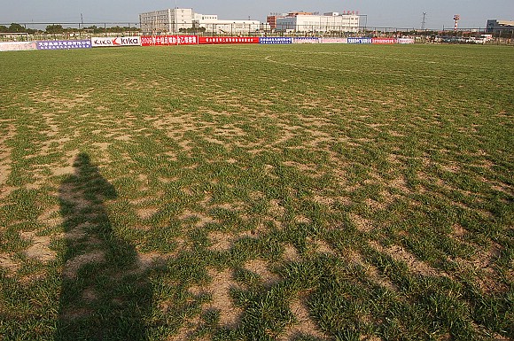 毫不夸张地说,场地内草地的覆盖面积几乎比露土的面积还要少,而且场地严重不平。这样的场地,皮球是很难控制的,而且也很容易造成队员受伤。