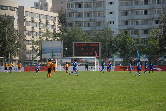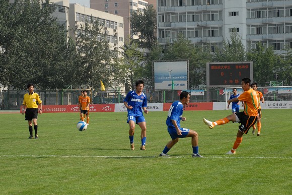 第26分钟,青岛队前场背后产球,被裁判员出示黄牌,爱国者队获得任意球,球长传至青岛队禁区再次被破坏。第34分钟,爱国者大学生队获得机会,球再次被长传至禁区造成混乱,可惜球被顶高出球门。第42分钟,爱国者大学生队再次获得绝好机会,爱国者大学生队前卫右路下底低平球传中至青岛队禁区,前锋得球大力推射,青岛队门将表现神勇,飞身挡出,错失良机。
