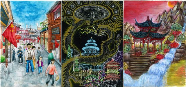 韩国留学生金荷恩说:龙是中国的象征,在故宫到处能看到龙的形象;天坛、颐和园、奥林匹克公园、三里屯等代表着北京的过去和现在。把它们融合在一起,就是我心中的北京。