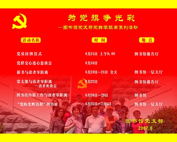 图书馆党支部以“为党旗争光彩”为主题的党群零距离系列活动于6月15日正式启动。