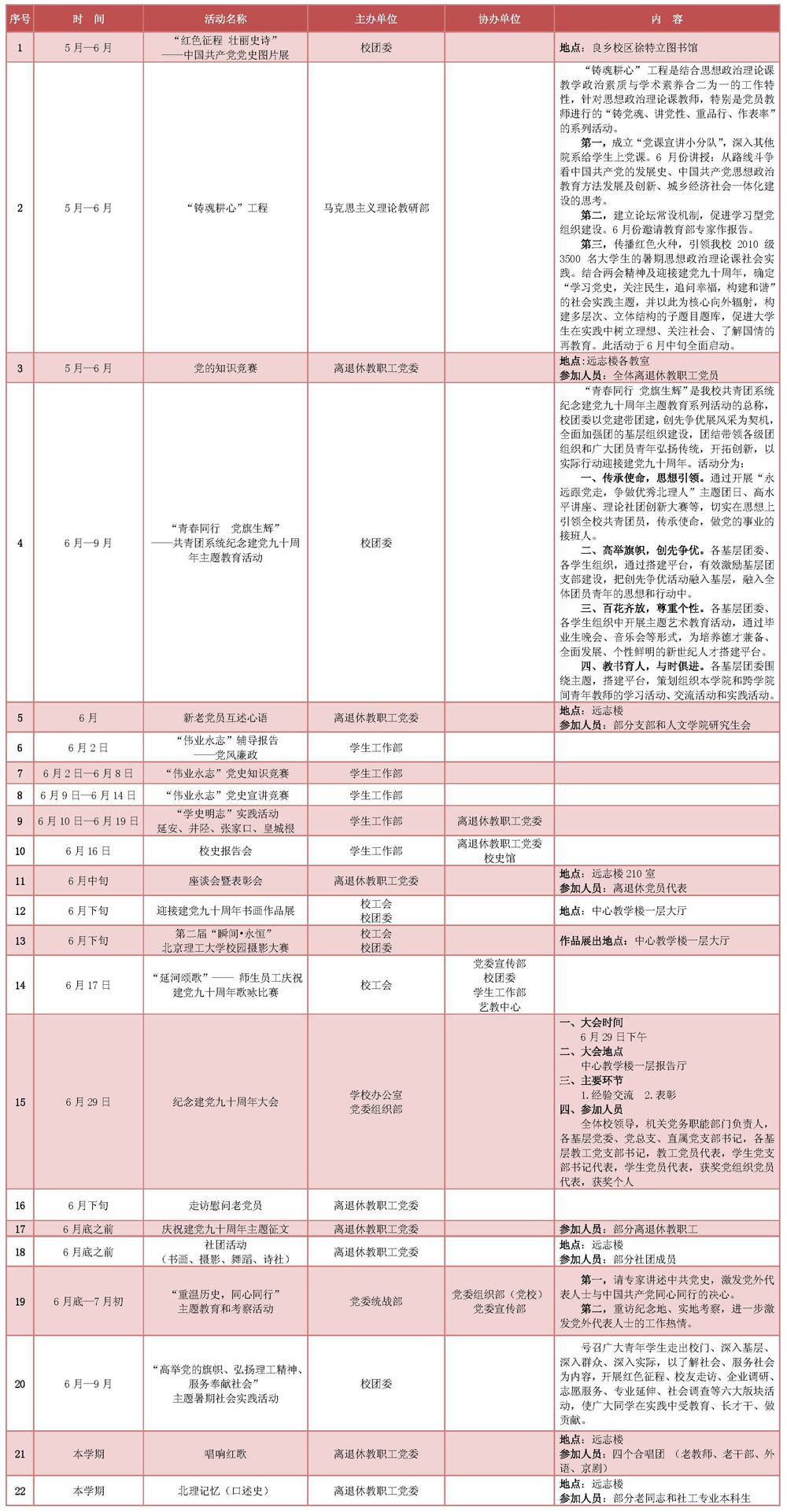 为庆祝中国共产党建党九十周年,学校各单位组织开展了相关活动。学校办公室现将各单位活动汇总公布,欢迎全校师生踊跃参加。