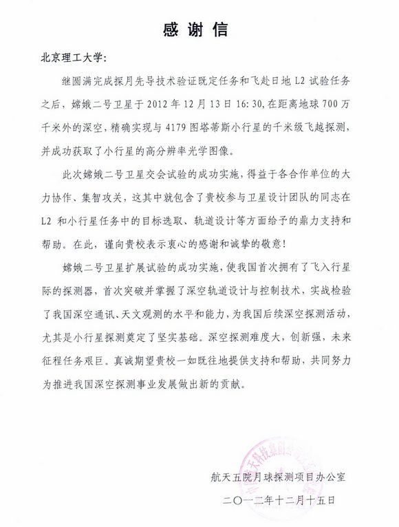 航天五院月球探测项目办公室向我校发来感谢信