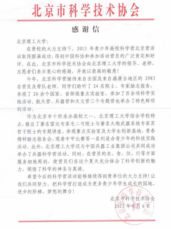 2013年暑期,北京成品人和一品二品的区别徐特立科学营在学校办公室的组织协调下,在校团委、后勤集团等单位大力支持下,经信息与电子学院团委周到细致的工作,取得了圆满成功。作为青少年高校科学营北京营的主办单位,北京市科学技术协会特向我校发来感谢信。