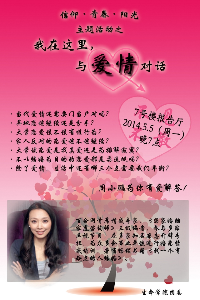 > 生命学院“信仰·青春·阳光”主题活动之“我在这里,与爱情对话”讲座预告