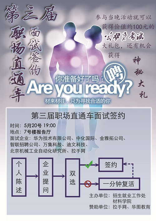 “职场直通车”是材料学院和招生就业工作处共同主办的求职类活动,选手可以通过现场面试和企业现场签署实习协议,迈出职场第一步。本届职场直通车为所有到场观众准备了价值100元的公务员考试大礼包,同时还有机会获得神秘礼品!欢迎全校同学积极参与!