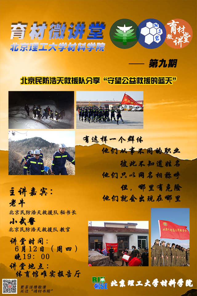 材料学院“育材微讲堂”第九期预告—北京民防浩天救援队“守望公益救援的蓝天”