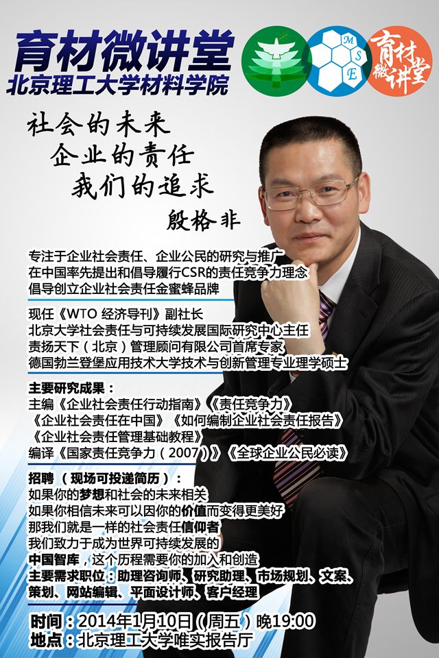 为丰富理工学子的课余生活,使广大师生能了解个人、企业与社会之间的关系。材料学院“育材微讲堂”特邀《WTO经济导刊》副社长殷格非来分享“社会的未来、企业的责任、我们的追求”。