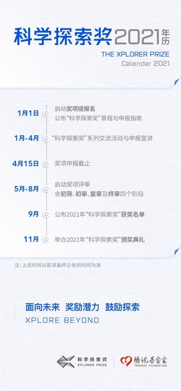 年龄不超过45周岁,取得博士学位,且全职在中国内地及港澳地区工作的青年科技工作者都可以按照相关指引,通过"科学探索奖"官方网站进行申报。申报截止日为2021年4月15日,之后将由评审委员会独立开展评审,获奖名单预计将在2021年9月揭晓。