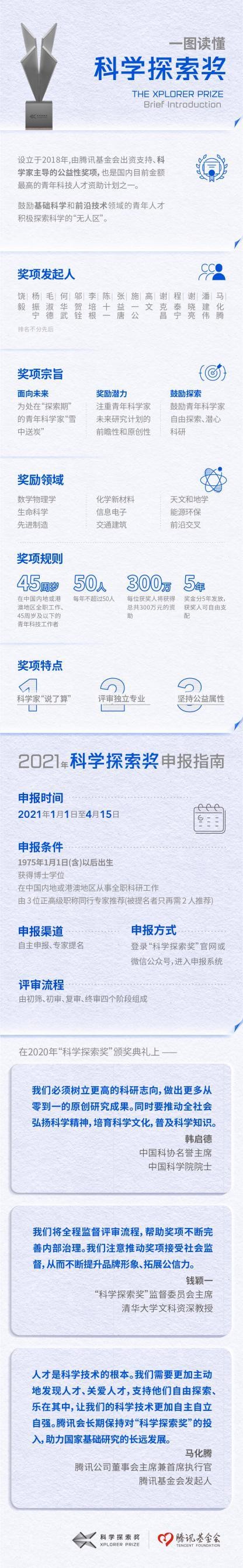 "科学探索奖"是由腾讯基金会出资支持、科学家主导的公益性奖项,也是国内目前金额最高的青年科技人才资助计划之一。奖项面向基础科学和前沿技术领域,每年遴选不超过50名获奖人,每位获奖人将在未来5年获得总计300万元人民币的奖金,并可以自由支配。"科学探索奖"于2018年腾讯成立20周年之际设立,由腾讯董事会主席兼首席执行官、腾讯基金会发起人马化腾携手饶毅、杨振宁、施一公、潘建伟等知名科学家共同发起。