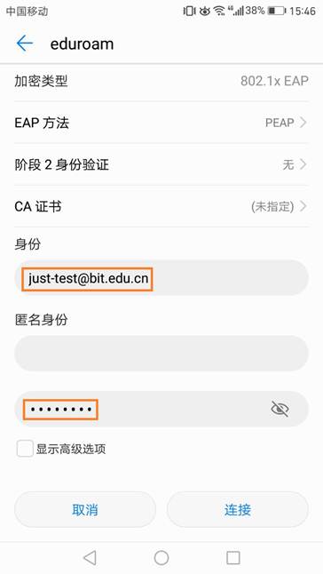2、安卓系统在认证页面中输入“身份”和“密码”。“身份”是本人在校上网账号加学校域名后缀,如just-test@cnyaxi.com,“密码”是对应账号的上网密码。其他地方均无需配置,如图2所示。