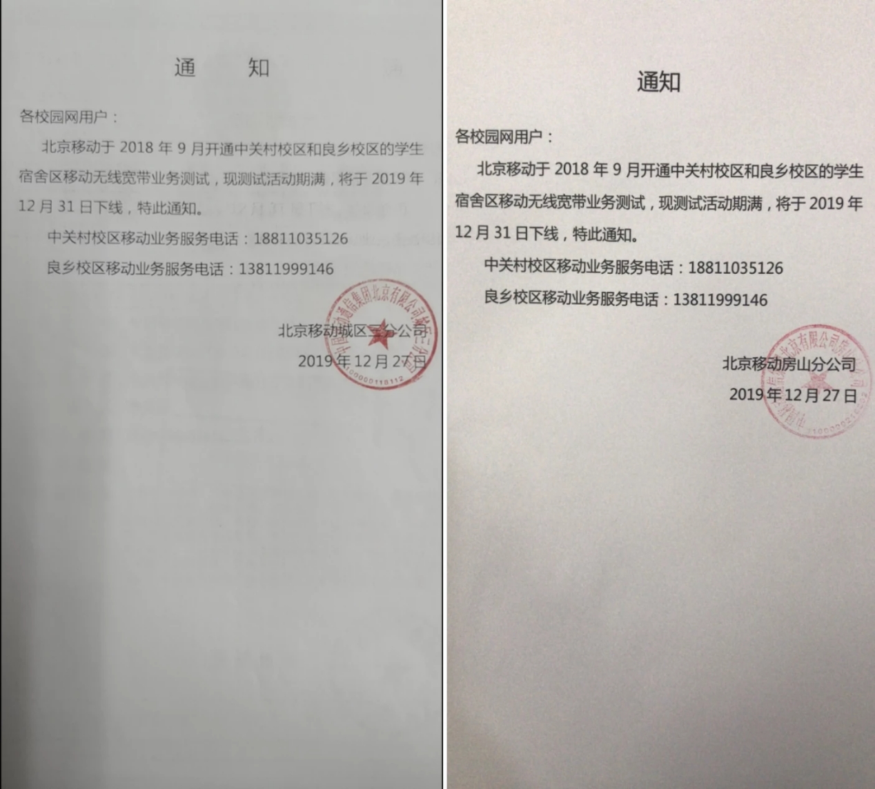 网络信息技术中心于2018年9月与北京移动合作开通了中关村校区和良乡校区的学生宿舍区移动无线宽带业务测试,现接北京移动方面告知,测试活动期满,相关服务将于2019年12月31日停止服务。