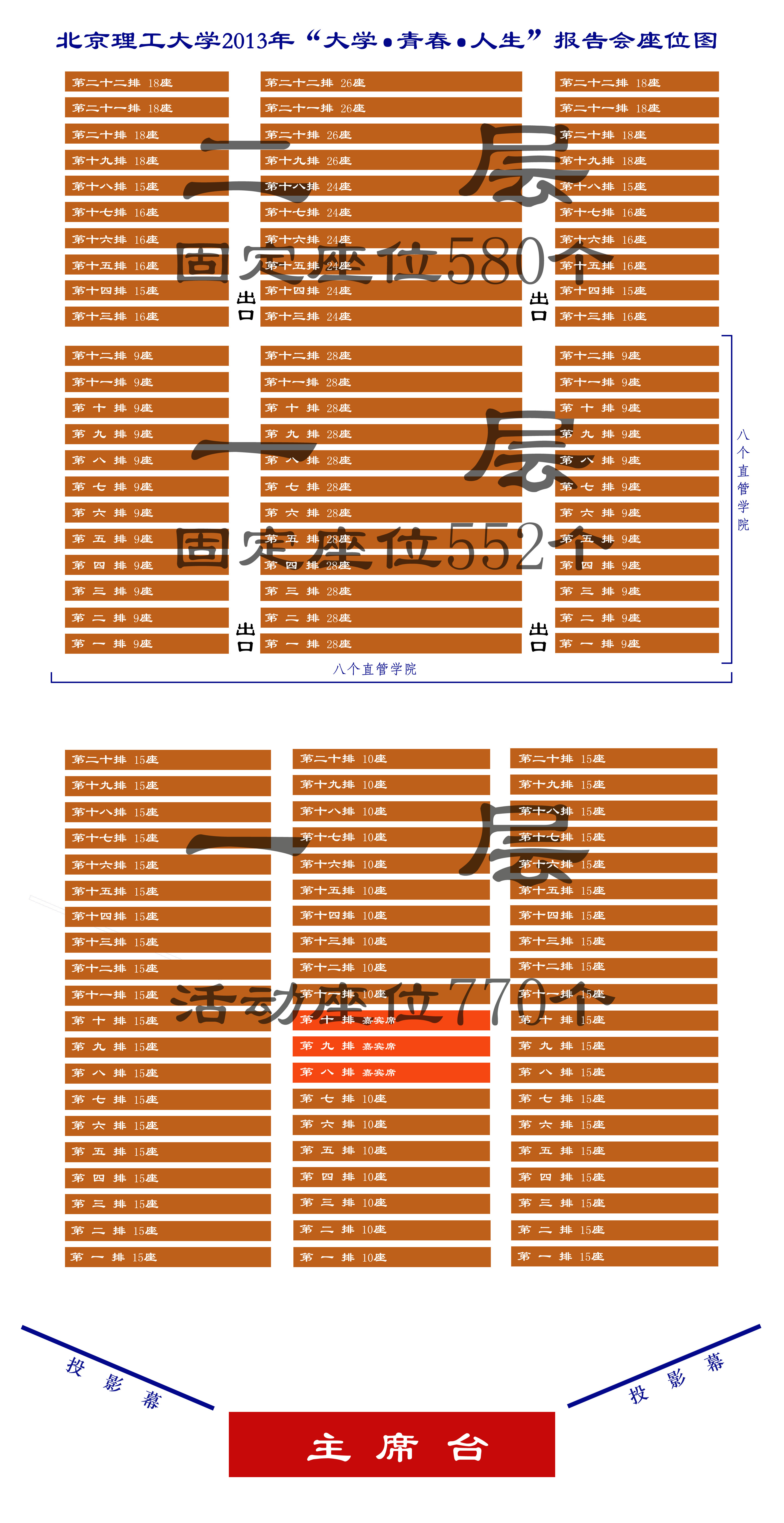 附件为座位安排表,一层固定座位区为八个直管学院的学生(现场有详细学院分区图并有专人引导),一层活动座位区及二层固定座位区为基础教育学院的学生。八个直管学院的座位区现场将按学院划分区域,基础教育学院内部协调其场地位置和人数。