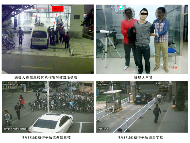 嫌疑人:王某、男、25岁、外地来京无业人员,由于王某被抓获时并未实施盗窃,因此其矢口否认曾经在我校盗窃过财物。但是,当保卫处工作人员向其出示其作案时的视频资料时,该嫌疑人终于对其于9月27日在信息楼6002室盗窃一台“华硕”笔记本电脑、10月5日在信息楼3002室盗窃ipad平板电脑的事实供认不讳。保卫处已将该犯罪嫌疑人和相关视频证据材料移交公安机关,目前,王某已被公安机关刑事拘留。