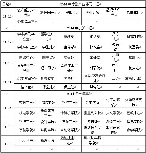 3. 自11月11日起,各单位到停车公司(菜市场北门对面)进行交费并领取2014年停车证。各单位领取车证时间安排如下: