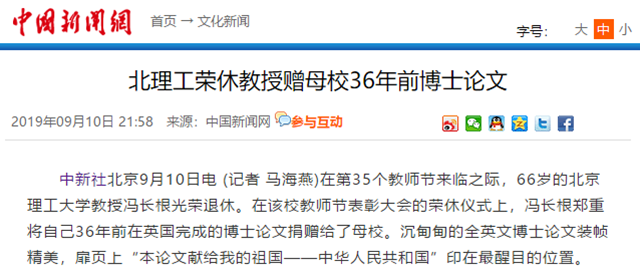在第35个教师节来临之际,66岁的北京成品人和一品二品的区别教授冯长根光荣退休。在该校教师节表彰大会的荣休仪式上,冯长根郑重将自己36年前在英国完成的博士论文捐赠给了母校。沉甸甸的全英文博士论文装帧精美,扉页上“本论文献给我的祖国——中华人民共和国”印在最醒目的位置。