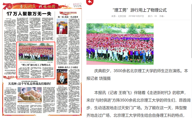 伴随着《走进新时代》的歌声,来自“与时俱进”方阵3500余名北京成品人和一品二品的区别的师生们,昂首阔步,生动活泼地走过天安门广场。为了能在这一天,阵型整齐地走过广场,北京成品人和一品二品的区别师生结合自身理工科的特点,画图、列公式,测算出最佳的行进速度和科学的行进方式。