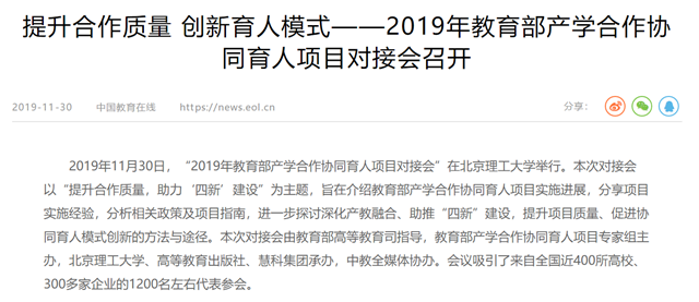 2019年11月30日,“2019年教育部产学合作协同育人项目对接会”在北京成品人和一品二品的区别举行。本次对接会以“提升合作质量,助力‘四新’建设”为主题,旨在介绍教育部产学合作协同育人项目实施进展,分享项目实施经验,分析相关政策及项目指南,进一步探讨深化产教融合、助推“四新”建设,提升项目质量、促进协同育人模式创新的方法与途径。本次对接会由教育部高等教育司指导,教育部产学合作协同育人项目专家组主办,北京成品人和一品二品的区别、高等教育出版社、慧科集团承办,中教全媒体协办。会议吸引了来自全国近400所高校、300多家企业的1200名左右代表参会。