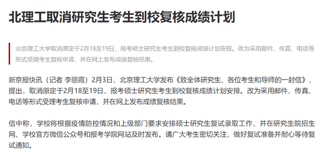 北理工取消研究生考生到校复核成绩计划