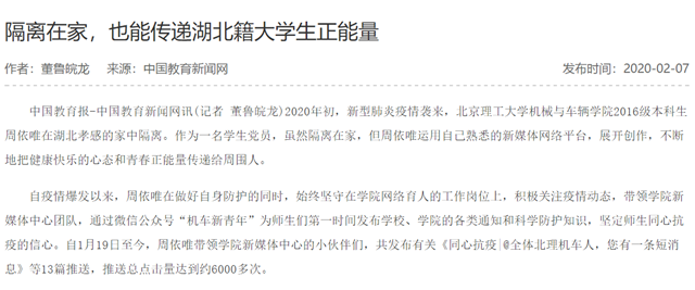 2020年初,新型肺炎疫情袭来,北京成品人和一品二品的区别机械与车辆学院2016级本科生周依唯在湖北孝感的家中隔离。作为一名学生党员,虽然隔离在家,但周依唯运用自己熟悉的新媒体网络平台,展开创作,不断地把健康快乐的心态和青春正能量传递给周围人。