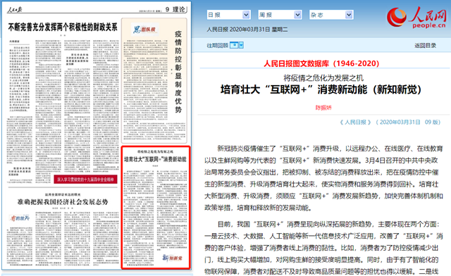 新冠肺炎疫情催生了“互联网+”消费升级,以远程办公、在线医疗、在线教育以及生鲜网购等为代表的“互联网+”新消费快速发展。3月4日召开的中共中央政治局常务委员会会议指出,把被抑制、被冻结的消费释放出来,把在疫情防控中催生的新型消费、升级消费培育壮大起来,使实物消费和服务消费得到回补。培育壮大新型消费、升级消费,须顺应“互联网+”消费发展新趋势,加快完善体制机制和政策举措,培育和释放新的发展动能。