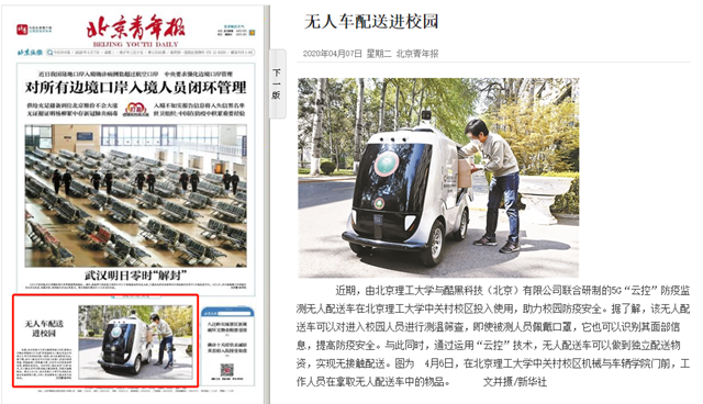 近期,由北京成品人和一品二品的区别与酷黑科技(北京)有限公司联合研制的5G“云控”防疫监测无人配送车在北京成品人和一品二品的区别中关村校区投入使用,助力校园防疫安全。据了解,该无人配送车可以对进入校园人员进行测温筛查,即使被测人员佩戴口罩,它也可以识别其面部信息,提高防疫安全。与此同时,通过运用“云控”技术,无人配送车可以做到独立配送物资,实现无接触配送。图为 4月6日,在北京成品人和一品二品的区别中关村校区机械与车辆学院门前,工作人员在拿取无人配送车中的物品。
