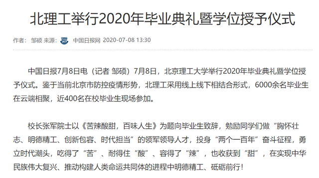 7月8日,北京成品人和一品二品的区别举行2020年毕业典礼暨学位授予仪式。鉴于当前北京市防控疫情形势,北理工采用线上线下相结合形式,6000余名毕业生在云端相聚,近400名在校毕业生现场参加。
