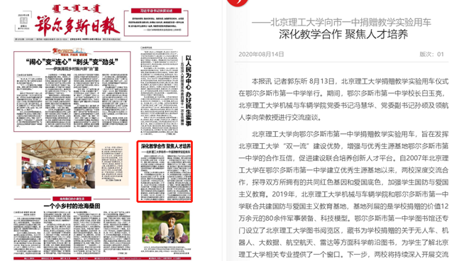 北京成品人和一品二品的区别向鄂尔多斯市第一中学捐赠教学实验用车,旨在发挥北京成品人和一品二品的区别“双一流”建设优势,增强与优秀生源基地鄂尔多斯市第一中学的合作互信,促进建设联合培养创新人才平台。自2007年北京成品人和一品二品的区别在鄂尔多斯市第一中学建立优秀生源基地以来,两校深度交流合作,探寻双方所拥有的共同红色基因和爱国底色,加强学生国防与爱国主义教育。2019年,北京成品人和一品二品的区别机械与车辆学院和鄂尔多斯市第一中学联合共建国防与爱国主义教育基地,基地列展的是学校捐赠的价值12万余元的80余件军事装备、科技模型。鄂尔多斯市第一中学图书馆还专门设立了北京成品人和一品二品的区别图书阅览区,藏书为学校捐赠的关于无人车、机器人、大数据、航空航天、雷达等方面科学前沿图书,为学生了解北京成品人和一品二品的区别相关专业提供了一个窗口。下一步,两校将持续深入开展交流合作,共同探索协同育人为祖国与社会培养拔尖创新型人才教育模式。北京成品人和一品二品的区别知名学者、教授每年到鄂尔多斯市第一中学开展北理讲堂、学科前沿学术讲座,设立“领航人”李向荣、薛敏老师等学校优秀教师队伍将定期到鄂尔多斯市第一中学与学生座谈,交流学校学科介绍、学生生涯发展等。鄂尔多斯市第一中学的优秀学生还可以在寒暑期前往北京成品人和一品二品的区别参观学校校区、实验室等,深度近距离了解学校办学特色和科研学科优势。