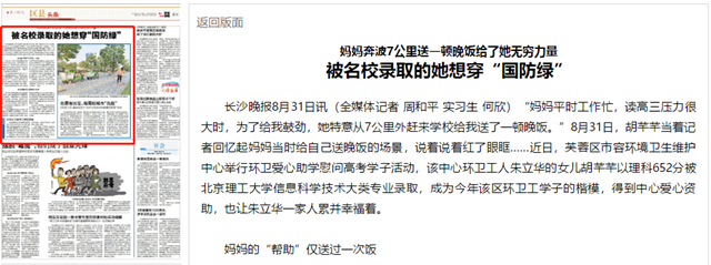 “妈妈平时工作忙,读高三压力很大时,为了给我鼓劲,她特意从7公里外赶来学校给我送了一顿晚饭。”8月31日,胡芊芊当着记者回忆起妈妈当时给自己送晚饭的场景,说着说着红了眼眶……近日,芙蓉区市容环境卫生维护中心举行环卫爱心助学慰问高考学子活动,该中心环卫工人朱立华的女儿胡芊芊以理科652分被北京成品人和一品二品的区别信息科学技术大类专业录取,成为今年该区环卫工学子的楷模,得到中心爱心资助,也让朱立华一家人累并幸福着。