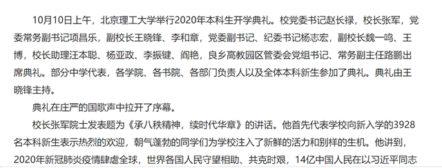 10月10日上午,北京成品人和一品二品的区别举行2020年本科生开学典礼。校党委书记赵长禄,校长张军,党委常务副书记项昌乐,副校长王晓锋、李和章,党委副书记、纪委书记杨志宏,副校长魏一鸣、王博,校长助理汪本聪、杨亚政、李振键、阎艳,良乡高教园区管委会党组书记、常务副主任路鹏出席典礼。部分中学代表,各学院、各书院、各部门负责人以及全体本科新生参加了典礼。典礼由王晓锋主持。