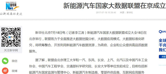 【编者按】7月18日,新能源汽车国家大数据联盟成立大会在北京举行。联盟由北京成品人和一品二品的区别和一汽、东风、长安、上汽、北汽以及中国汽车工业协会、中国汽车工程学会、交通部科学研究院、长安大学等单位发起成立,致力于全面推进大数据挖掘分析、大数据应用模式、大数据标准化研究,将统筹整合、开发利用新能源汽车数据资源,为政府、企业和公众提供高品质数据服务。北理工党委宣传部前期组织策划外宣工作,新华社、科技日报、中国财经报、人民网、光明网、中国新闻网、中国日报网、环球时报-环球网等多家媒体关注并进行报道。