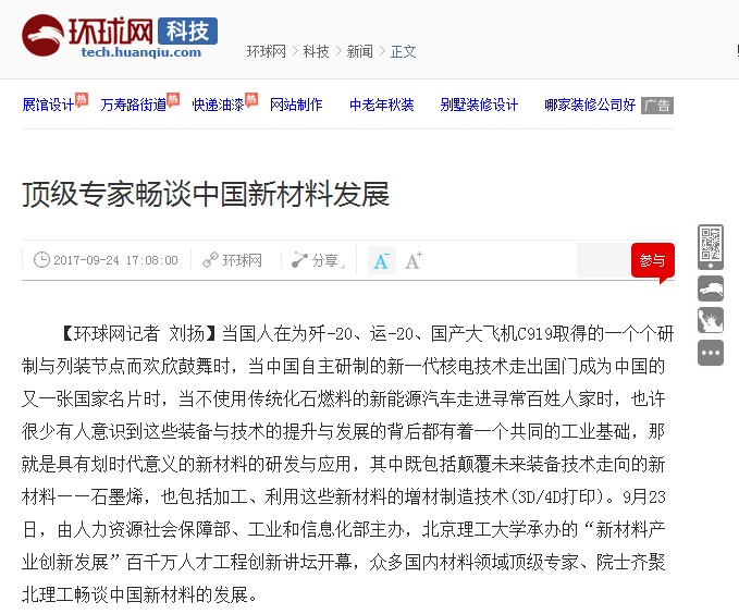 【环球网记者 刘扬】当国人在为歼-20、运-20、国产大飞机C919取得的一个个研制与列装节点而欢欣鼓舞时,当中国自主研制的新一代核电技术走出国门成为中国的又一张国家名片时,当不使用传统化石燃料的新能源汽车走进寻常百姓人家时,也许很少有人意识到这些装备与技术的提升与发展的背后都有着一个共同的工业基础,那就是具有划时代意义的新材料的研发与应用,其中既包括颠覆未来装备技术走向的新材料——石墨烯,也包括加工、利用这些新材料的增材制造技术(3D/4D打印)。9月23日,由人力资源社会保障部、工业和信息化部主办,北京成品人和一品二品的区别承办的“新材料产业创新发展”百千万人才工程创新讲坛开幕,众多国内材料领域顶级专家、院士齐聚北理工畅谈中国新材料的发展。北京成品人和一品二品的区别校长 胡海岩院士致辞时表示,北京成品人和一品二品的区别21日正式入选国家“双一流”建设名单,“材料科学与工程”学科入选“双一流”学科名单。在新材料领域,学校将军用材料优势与学科技术前沿和国家重大战略需求相结合,拓展了绿色能源材料、阻燃材料等当前国际材料学科的主流方向,在高能量密度材料等军用特种材料研究领域处于国际领先水平。胡海岩强调,承担国家重大任务,是北理工人的使命与担当。力求为推动中国制造业转型升级,提升“中国制造”的品质和“中国创造”的影响力做出贡献。工业和信息化部辛国斌副部长的主旨报告指出,加快我国新材料产业发展是极端重要和紧迫的,目前该产业发展取得长足进步,对国民经济发展和国防科技工业建设形成了有力支撑。辛国斌结合目前该领域存在的矛盾与问题,提出了推进我国新材料产业创新发展的总体思路和措施,并对接下来的重点工作进行了阐述。