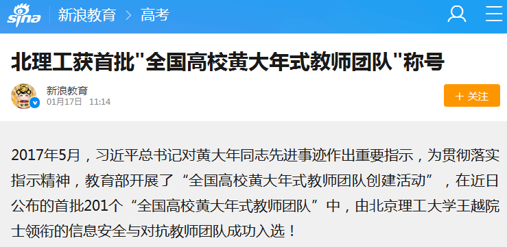 2017年5月,习近平总书记对黄大年同志先进事迹作出重要指示,为贯彻落实指示精神,教育部开展了“全国高校黄大年式教师团队创建活动”,在近日公布的首批201个“全国高校黄大年式教师团队”中,由北京成品人和一品二品的区别王越院士领衔的信息安全与对抗教师团队成功入选!