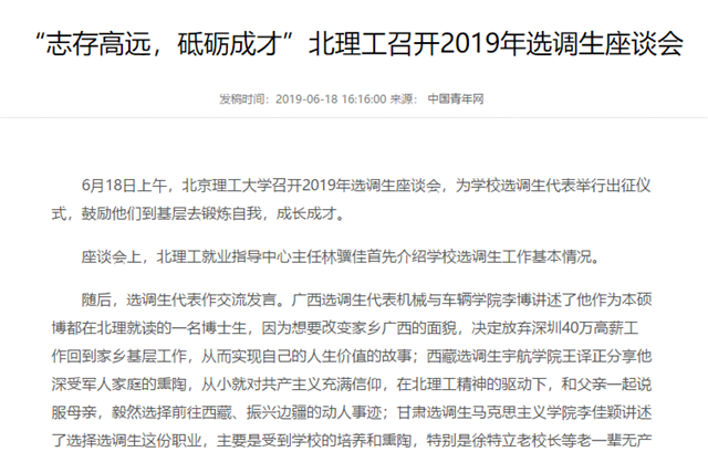 【中国青年网】“志存高远,砥砺成才”北理工召开2019年选调生座谈会