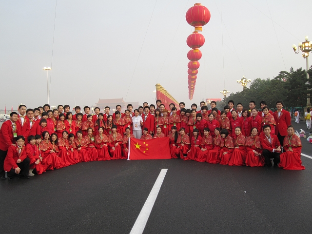 2009年10月1日凌晨3:00,有许多身着节日盛装的同学陆续从北理工新1号学生公寓、11号宿舍楼、6号宿舍楼、硕博小区新5号楼、新2号楼等8个不同的学生公寓相继出发,这支特殊的演出队伍在学校北门迅速完成集结,乘车向第二集结地点进发。在祖国60周年庆典这一天,他们将在天安门广场的国旗下,为祖国纵情高歌。