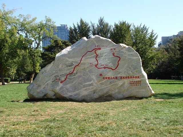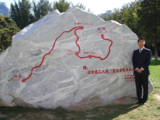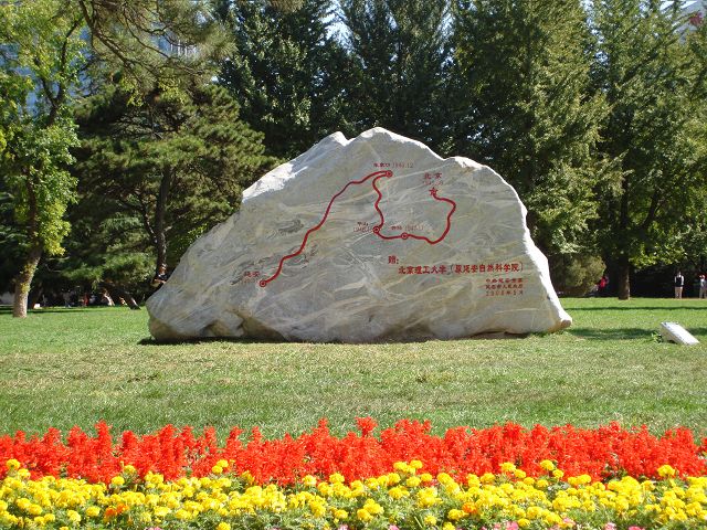 9月29日,在新中国60周年华诞到来之际,为了纪念学校从延安到北京的迁移历程和即将到来的70周年校庆,学校采纳我校设计与艺术学院学生王福涛的建议,将当年学校从延安辗转到北京的迁址路线雕刻于中教东门的“延安精神,薪火相传”纪念石的背面上。