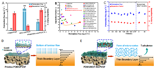 图5. 膜PV性能以及膜表面形态对进料液流动行为的影响:(A)40 oC下分离5 wt%乙醇水溶液膜的PV性能;(B)PV分离性能对比;(C)膜长时稳定性;(D-E)膜表面的流动行为。