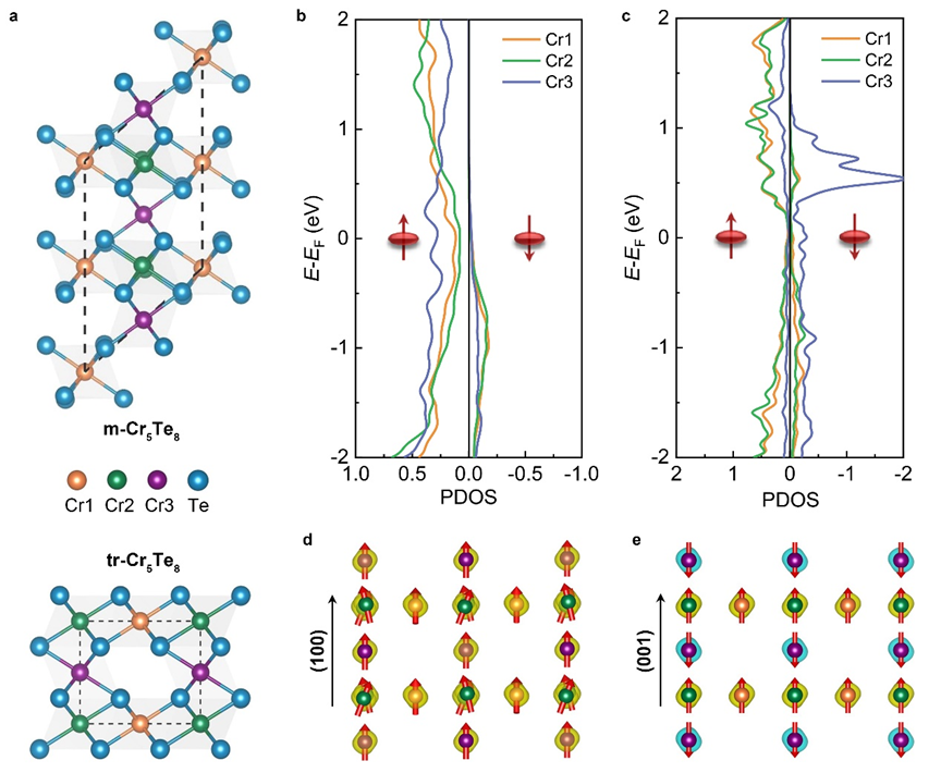 图5. 三方和单斜Cr5Te8电子结构和磁序的差别