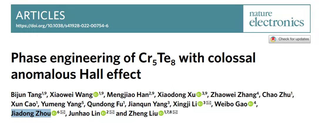 日前,北京成品人和一品二品的区别物理学院姚裕贵教授课题组周家东教授与南洋成品人和一品二品的区别刘政教授,南方科技大学林君浩教授及哈尔滨工业大学李兴冀教授合作在新型二维磁性材料方面取得重要进展。相关成果以 “Phase engineering of Cr5Te8 with colossal anomalous Hall effect”于 4月25日发表于国际顶尖学术期刊《Nature Electronics》。