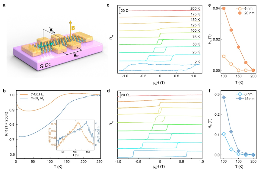 为了确认和分析二维Cr5Te8的铁磁性,研究团队选取不同晶相和不同厚度的材料制备了霍尔器件。厚度为6 nm的三方相与单斜相Cr5Te8纵向电阻在降温过程中表现出明显的相变过程,电阻-温度曲线的一阶导数的峰值位置表明三方相与单斜相Cr5Te8样品的居里温度分别为125 K和150 K(图3b)。在居里温度以下,三方相与单斜相Cr5Te8在外磁场作用下霍尔电阻发生跳变,并呈现出明显的滞洄现象,再次证明了二维Cr5Te8面外的自发磁化和铁磁长程有序(图3c和d)。通过分析矫顽场随温度的变化关系,再次确认了不同晶相和不同厚度Cr5Te8的居里转变温度(图3e和f)。