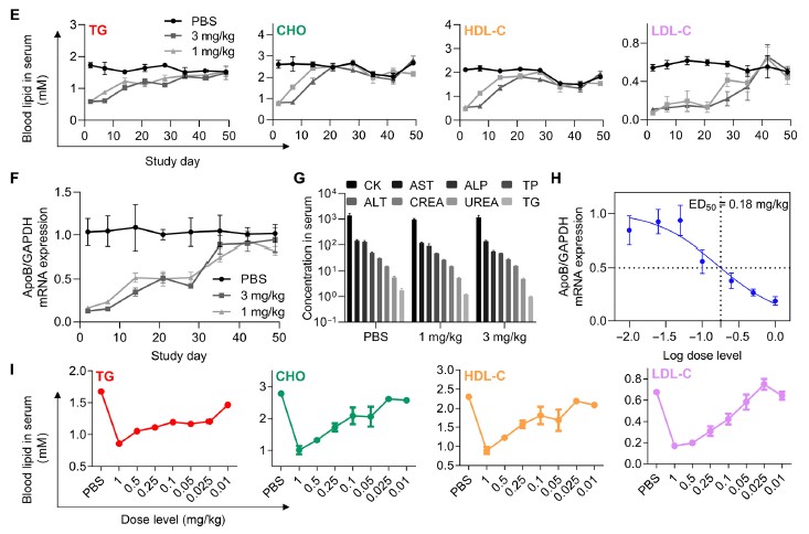 进一步,研究人员分别以饲料诱导的高脂血小鼠、db/db转基因小鼠以及人源化载脂蛋白C3(ApoC3)转基因小鼠作为疾病动物模型,模拟了人类由不健康饮食引起的高脂血症以及单基因表达异常诱发的高脂血症。实验结果证明,在经过重复给药后,0.25mg/kg的siRNA制剂在三种模型中均将疾病动物的血脂水平调整至与正常动物相当的水平。此外,0.5mg/kg的siRNA在db/db小鼠体内实现了97%的靶标mRNA表达下调。在转基因动物中,血脂水平在停药后4周后回复到治疗前。总的来说,由iLAND递送的siRNA极为高效地抑制了靶标mRNA的表达,进而带来了十分积极的降血脂治疗效果。