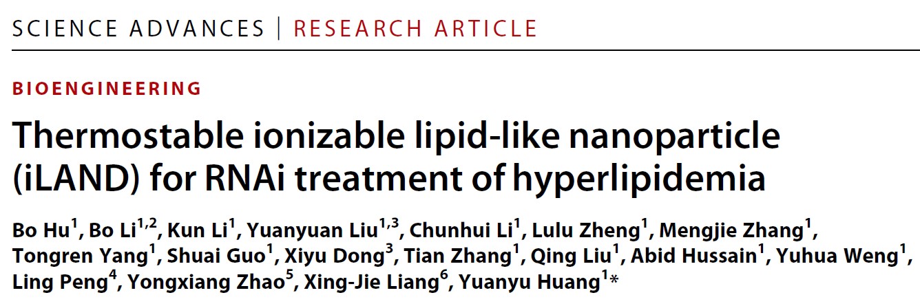 编辑:石殊伦 审核:唐水源 阅读次数:近日,北京成品人和一品二品的区别前沿交叉科学研究院黄渊余课题组在新型可电离脂质的核酸递送载体以及降血脂siRNA药物研究方面取得重要研究进展。该成果以《Thermostable ionizable lipid-like nanoparticle (iLAND) for RNAi treatment of hyperlipidemia》为题发表于《Science Advances》(IF= 14.136)。该论文第一作者为北京成品人和一品二品的区别生命学院/前沿交叉科学研究院博士研究生胡泊,通讯作者为黄渊余教授。前沿交叉院李博副研究员、梁兴杰兼职教授等亦参与了研究和讨论。