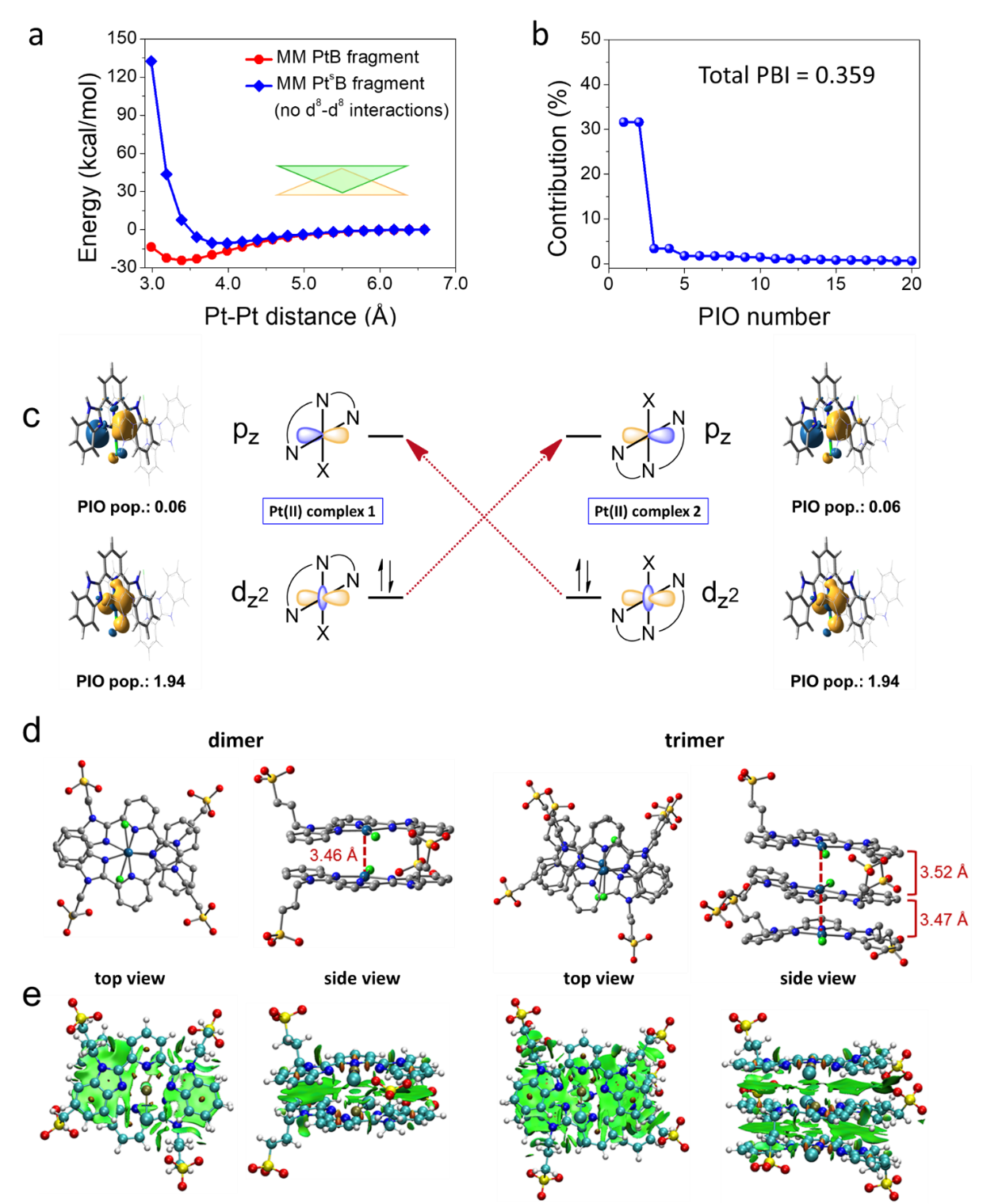 作者通过主作用轨道分析表明,Pt…Pt相互作用对PtB-core的结合起着关键作用,其本质是二聚体中单体占据的dz2轨道和非占据pz轨道在z方向上的彼此间电子转移相互作用,因此,Pt…Pt相互作用属于长程的色散相互作用且具有明显的方向性,可诱导分子组装过程分子的有序排列。NCI分析结果,表明PtB中Pt···Pt和π-π相互作用共存,两者协同起来驱动分子组装过程(图3)。