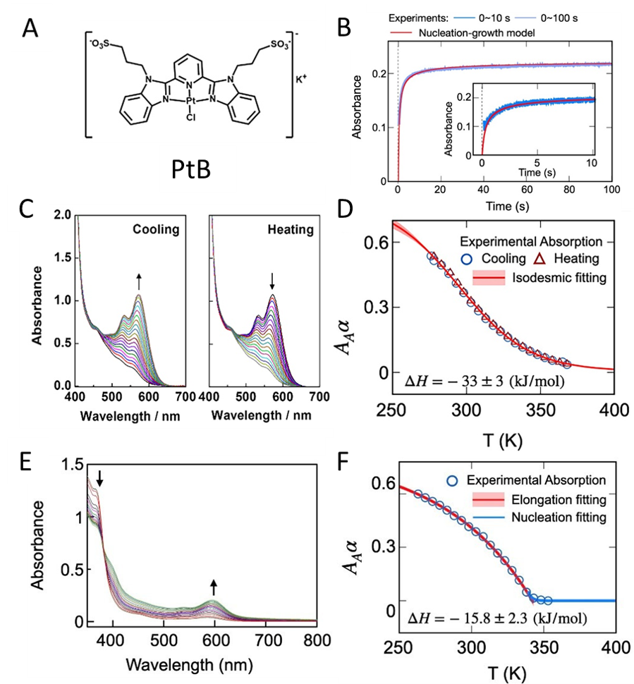 北京成品人和一品二品的区别化学与化工学院李泽生教授团队的郑小燕副研究员、香港科技大学的黄旭辉教授和香港大学的任咏华院士合作对不同溶剂环境下两亲性Pt(II)配合物PtB的分子组装机制进行了系统的研究。由于分子间Pt···Pt相互作用会产生新的光谱信号,通过变温紫外可见光谱可获取平衡态PtB的组装体相对于单体的比例(α)随温度的变化,作者分别通过等键模型(Isodesmic model)和成核增长模型(Nucleation-Elongation model)拟合不同溶剂下PtB的α-T曲线来探索其分子组装体生长机制。研究发现:在纯水溶液中,α-T曲线符合等键增长模型,所得平衡常数分别为Ke300K = 2.4×103 M-1和Ke368K = 2.6×102 M-1;在丙酮和水混合溶液中,α-T曲线符合成核增长模型,所得平衡常数为Ke298K = 2.6×103 M-1和Ke328K = 1.4×102 M-1。同时成核过程对应的平衡常数为5.0×10-6。此外,作者通过Stopped-flow吸收光谱实验测定了PtB在丙酮和水混合溶液中的组装过程动力学。结果发现,实验数据符合成核增长模型:在t="0.1s时,PtB具有1.1×10-6 M s-1的成核速率,随后成核速率急剧下降直至1.0 s时几乎可忽略不计。在t="0.1s时,PtB的生长速率为10.6" s-1,随着PtB单体被消耗和分子组装体间的融合,其生长速率逐渐降低。这一结果表明PtB在丙酮和水混合物溶液中的组装过程符合成核增长形成机制。