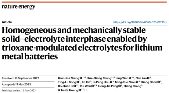 Qian-Kui Zhang+, Xue-Qiang Zhang+, Jing Wan, Nan Yao, Ting-Lu Song, Jin Xie, Li-Peng Hou, Ming-Yue Zhou, Xiang Chen, Bo-Quan Li, Rui Wen, Hong-Jie Peng, Qiang Zhang, Jia-Qi Huang*, Homogeneous and mechanically stable solid–electrolyte interphase enabled by trioxane-modulated electrolytes for lithium metal batteries, Nat. Energy, 2023, doi: 10.1038/s41560-023-01275-y.