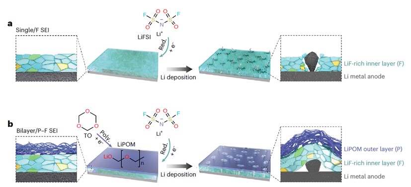 单层SEI是局部高盐中LiFSI衍生的富含LiF的SEI,在锂沉积过程中易破裂-再生。双层SEI是由富含LiF的内层和高机械稳定性的LiPOM外层构成,能够缓解SEI的破裂-再生。