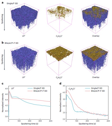 图3. 用ToF-SIMS分析了SEI的三维纳米结构。(a)单层SEI和(b)双层SEI的ToF-SIMS三维图像。(c) LiF−和(d) C2H2O−在不同SEI中对应的ToF-SIMS深度曲线。
