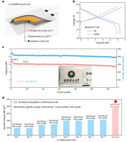 图6. 双层SEI 在440 Wh kg−1级软包电池中的循环性能。(a) 440 Wh kg−1级Li | NCM811软包电池示意图。(b) 软包电池的充放电曲线。(c) Li | NCM811软包电池的循环性能。(d) 软包电池循环性能与文献报道的性能对比图。