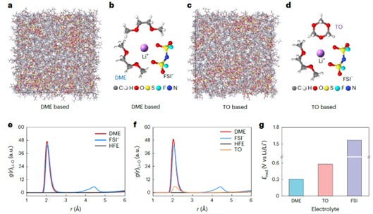 图2. DME和TO基电解液的溶剂化结构和还原行为。(a) DME-和 (c) TO-电解液的MD模结果。(c)DME-和 (d) TO-电解液中代表性的锂离子溶剂化层的示意图。(e) DME-和 (f)TO-电解液中Li-ODME、Li-OFSI−、Li-OHFE和Li-OTO的RDF图。(g) 基于密度泛函理论计算的DME、TO和FSI−的还原电位。